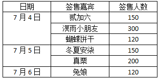 所有嘉宾签售权均在嘉宾签售当日上午 9:00 -11:00,亲自前往签售服务台(二楼展厅签售区)进行预约登记,登记完成后,工作人员在现场进行公平抽签,抽取人数如下:(整个抽签过程不收取任何费用。)