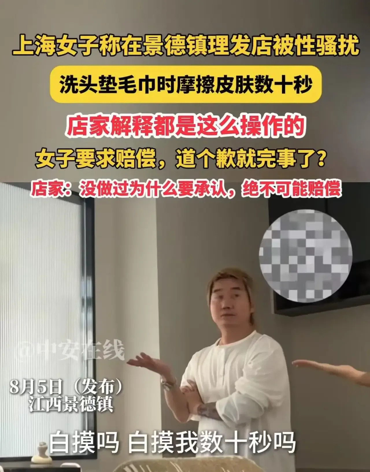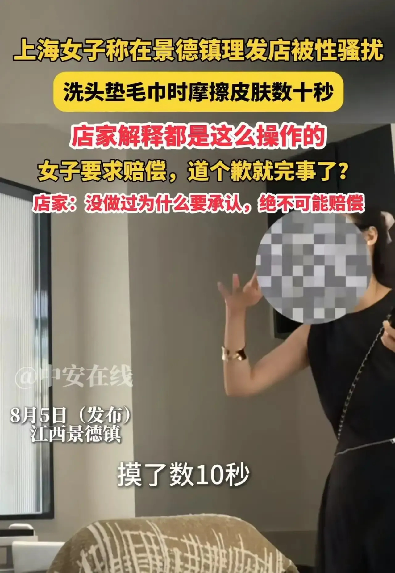 奇葩!上海icon女子在景德镇理发店洗头,称被性骚扰。女子:“手伸进去摸了我十几秒!”理发店老板:“这是正常操作, 洗头要翻衣领把毛巾塞进去,碰到脖子很正常,又不是碰到什么隐私的部位。网友:如果这都能赔偿,那我天天去理发店洗头,不用打工了!